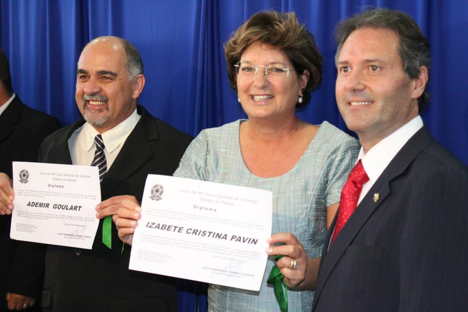 Ontem(22) às 14:00 tivemos no Fórum Eleitoral de Colombo a sua Diplomação ” A Justiça Eleitoral encerra suas atividades referentes ao pleito de 2012 com a diplomação dos 21 vereadores e a diplomação de Beti Pavin e seu vice Ademir Goulart” disse o Juiz Eleitoral Luiz Fernando Keppen. Do Fórum, a nova prefeita foi conduzida pelo povo até a Câmara Municipal para a cerimônia de posse, onde fez o juramento e juntamente com o seu vice Ademir Goulart(PMDB) foram empossados pelos 19 vereadores presentes, na presença de deputados, representantes religiosos e representantes do Governo Estadual e Federal .
