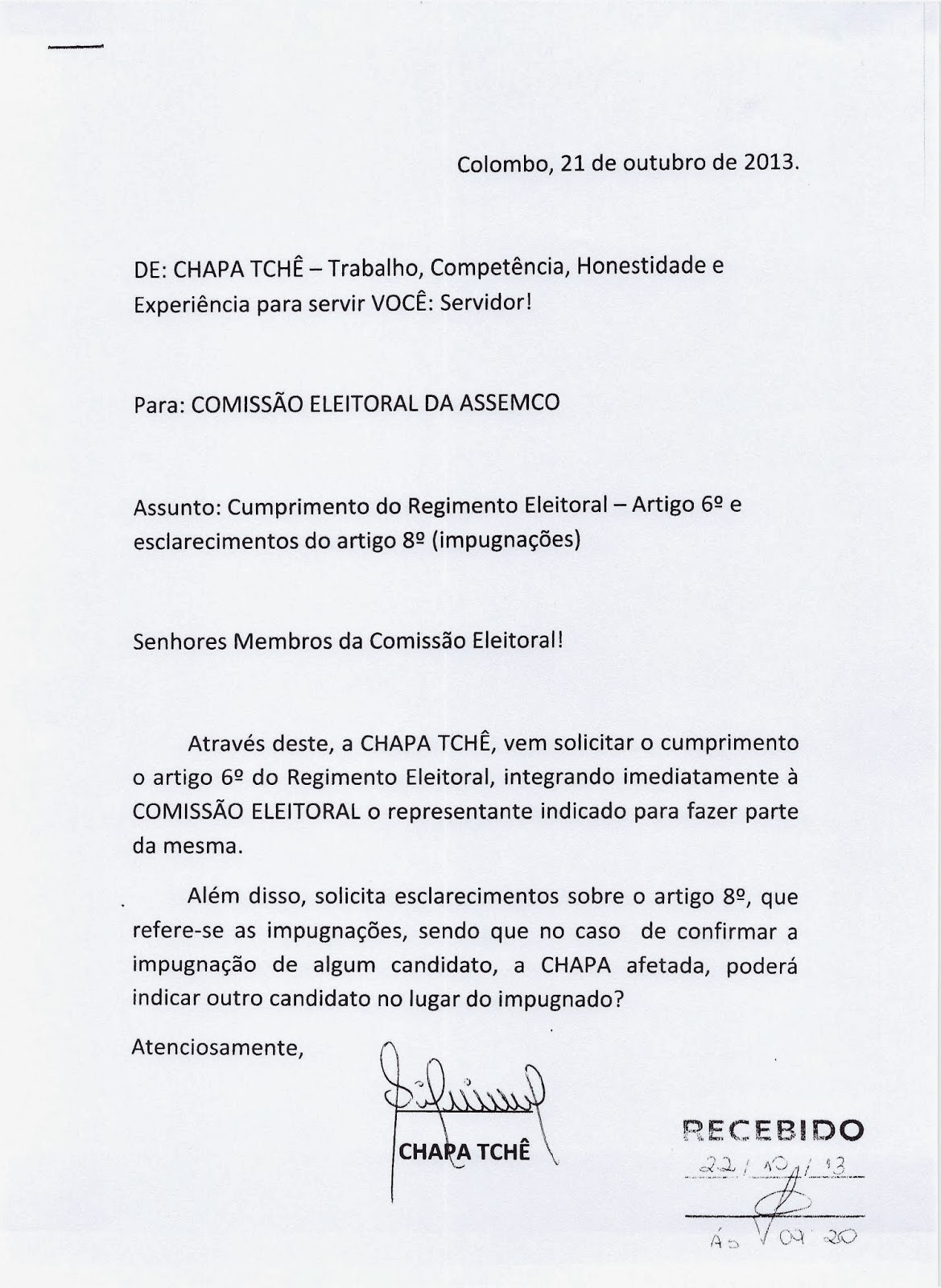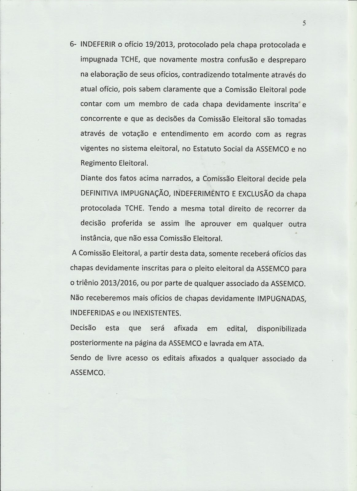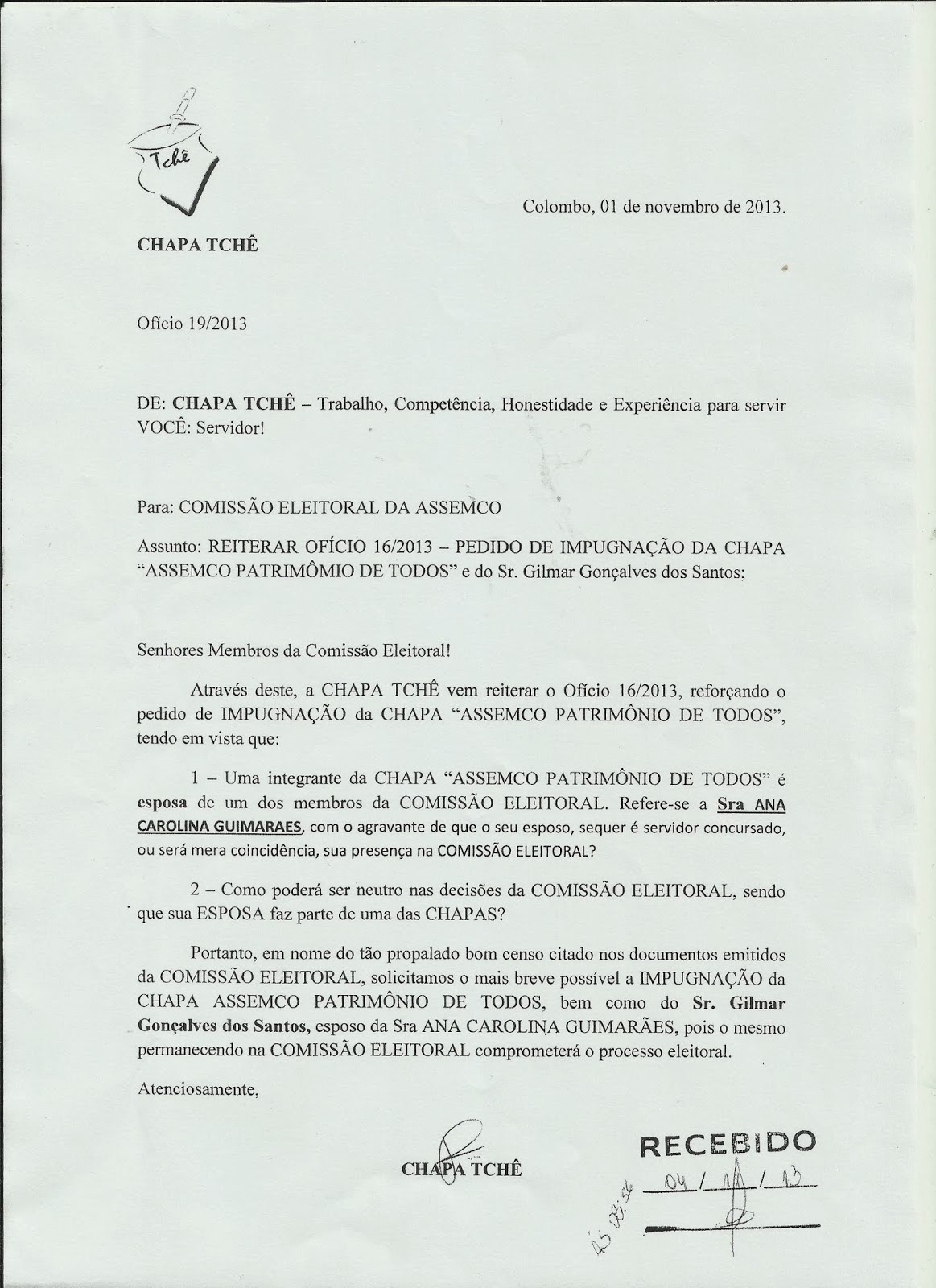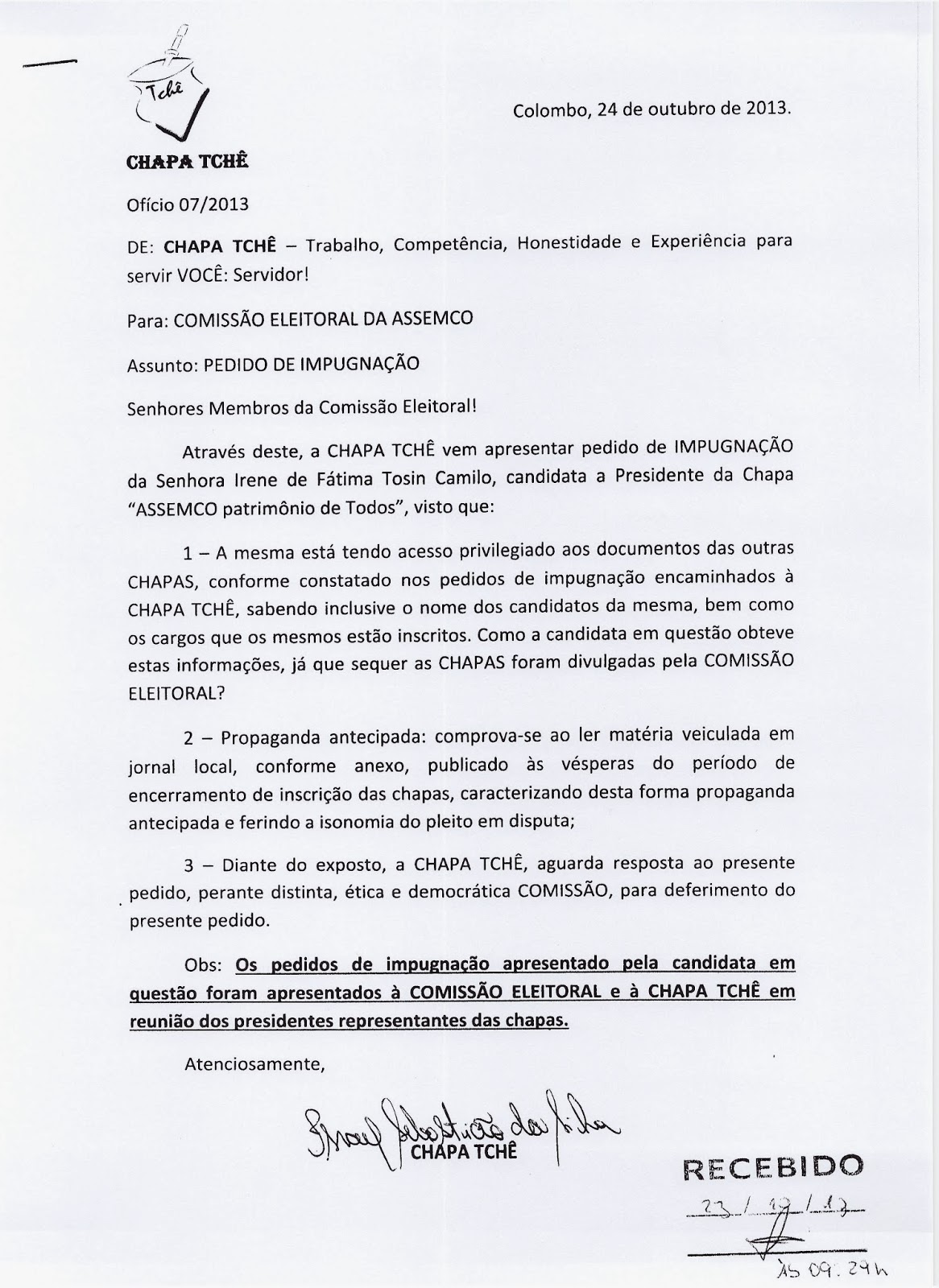 A chapa TCHÊ, “ficou sem cuia e o chimarrão virou um tereré”, pois não conseguiram se adequar as normas do Estatuto Social da ASSEMCO e foram IMPUGNADOS, segundo declaração da Comissão Eleitoral, através do seu presidente Wilson Vieira, a Chapa TCHÊ, desrespeitou os prazos legais estipulados, fez propagando eleitoral antecipada, entre outras irregularidades, por isso foi ELIMINADA.