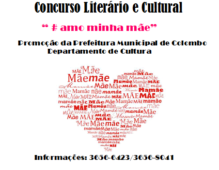 A Prefeitura de Colombo, por meio do Departamento de Cultura lança o Concurso Cultural “# amo minha mãe”, voltado aos alunos matriculados na rede de ensino pública e particular do município. A premiação será separada por categorias – Desenho e Poesia.