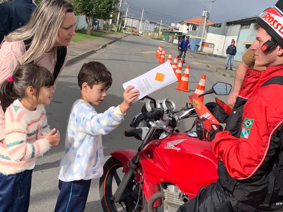 Durante o período de bloqueio nas vias, os policiais militares do PPTRAN realizavam orientação e entregavam juntos com as crianças e professores panfletos com dicas de segurança, para os motoristas que passavam pelo local, dessa forma conscientizando e reforçando a educação no trânsito para a prevenção de acidentes.