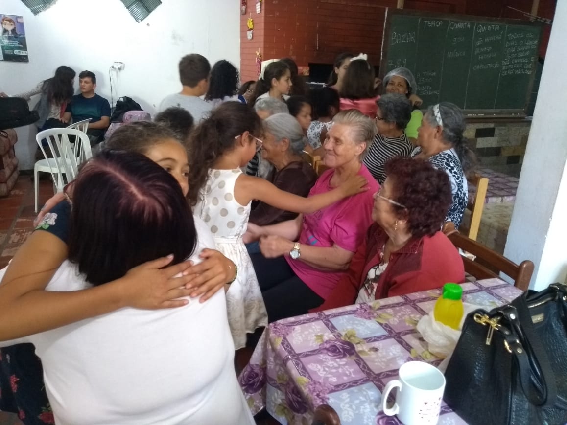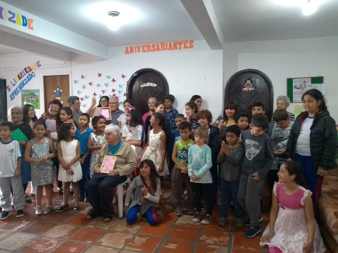 Durante as atividades interativas com os 20 idosos presentes, as crianças integrantes do Serviço de Convivência e Fortalecimento de Vínculos (SCFV), do município de Colombo, apresentaram um teatro de música e dança. Após um delicioso café, houve a troca de presentes, sendo que cada idoso recebeu uma cartinha, já as crianças foram presenteadas com a uma toalhinha confeccionada no Centro de Convivência.