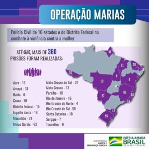 A Operação Marias foi realizada no combate aos crimes de violência contra a mulher. Houve a participação de 16 Estados e do Distrito Federal. E foram empregados mais de 2 mil policiais civis e 622 viaturas, resultando na prisão de 363 pessoas e apreensão de 41 armas de fogo e 1.386 munições. Ressalta-se que devido à natureza do delito, que exige urgência no cumprimento, não há mandados represados, são mandados recebidos nos últimos dias pelas Polícias Civis. Fonte: