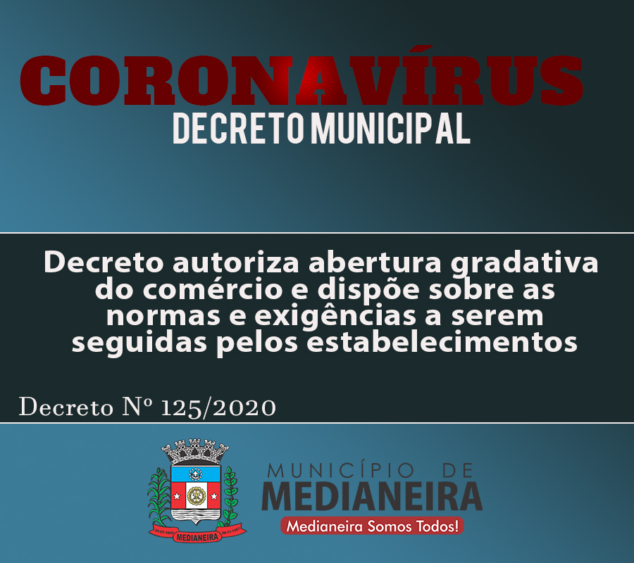 Foi publicado na tarde desta terça-feira (07) o Decreto Nº 125/2020, que dispõe sobre adequações nas medidas para enfrentamento da emergência de saúde pública de importância internacional decorrente do novo Coronavírus COVID-19. E pontua sobre a abertura gradativa do comércio, bem como as normas e exigências que devem ser seguidas pelos estabelecimentos.