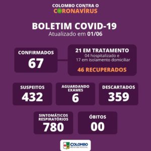BOLETIM COVID-19 – 01/06 Colombo já tem 67 casos confirmados