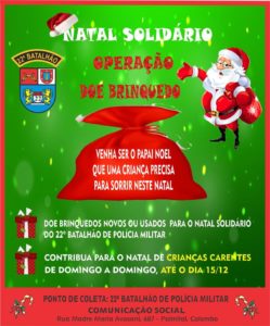 “Que o sentido de Natal esteja sempre presente em nossos corações e que a esperança e o sorriso de uma criança seja um objetivo concretizado”. É com esse pensamento que realizaremos mais uma Campanha do Natal Solidário do 22º Batalhão de Polícia Militar.