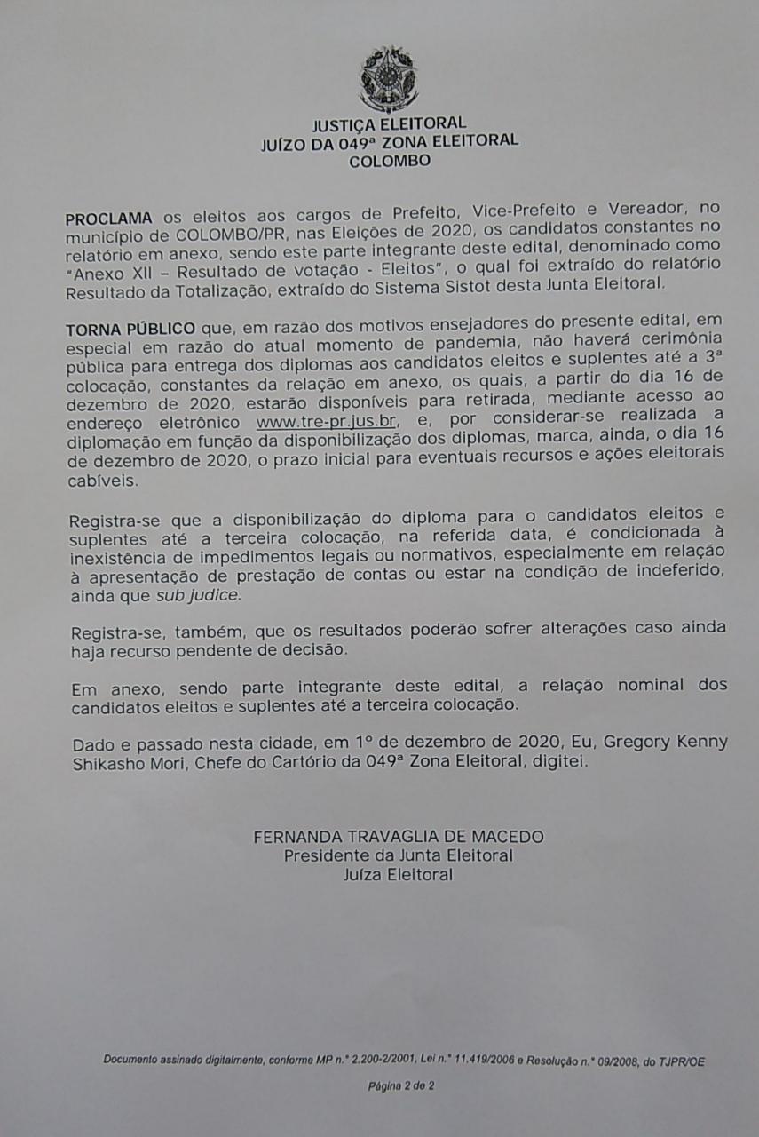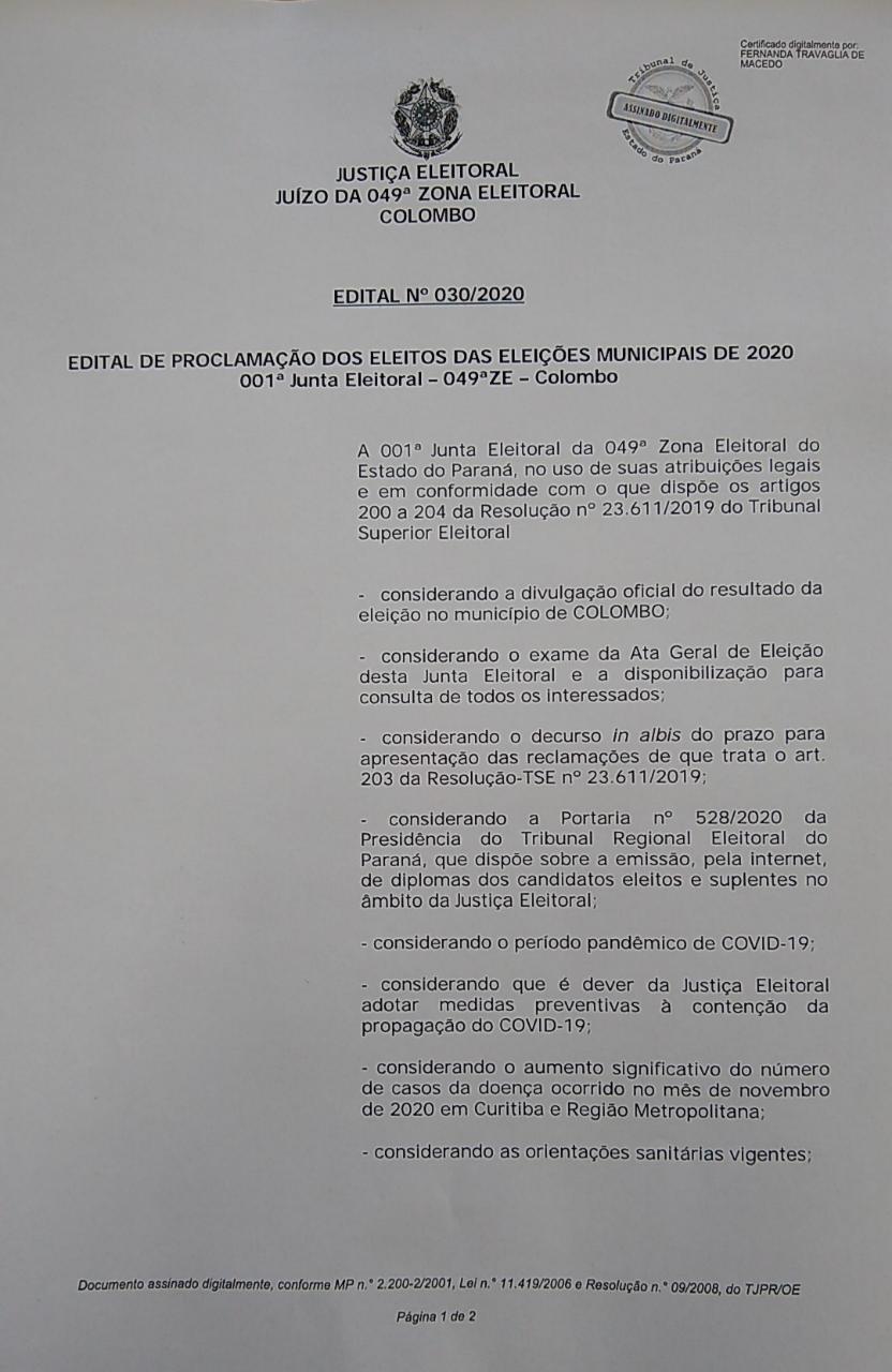 A Juíza Eleitoral Fernanda Travaglia de Macedo, da 049ª Zona Eleitoral de Colombo, através do Edital Nº 030/2020(Proclamação dos Eleitos das Eleições Municipais de 2020), considerando que é dever da Justiça Eleitoral adotar medidas preventivas ao COVID-19, decidiu que não haverá cerimônia pública para entrega dos diplomas aos candidatos eleitos.