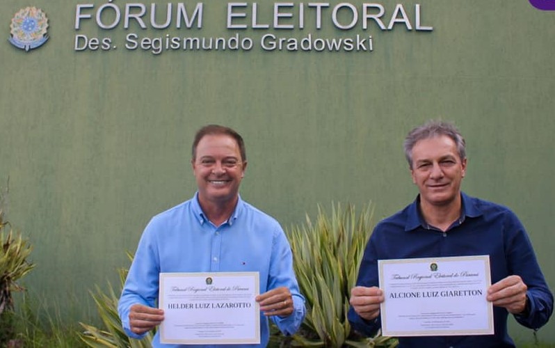 Os diplomas a partir desta terça-feira(16), estarão disponíveis para retirada, mediante acesso ao endereço eletrônico www.tre-pr.jus.br. O prefeito eleito eleito Helder Luiz Lazarotto (PSD) e o seu vice, Alcione (Republicanos), estiveram nesta terça-feira, recebendo seus receptivos diplomas.