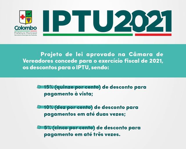 O Projeto de Lei do Executivo nº 3/2021 que dispõe sobre a concessão de desconto de 15% para pagamento à vista do Imposto Predial e Territorial Urbano (IPTU) no exercício de 2021 no município de Colombo. O projeto foi aprovado por unanimidade, em segunda votação e segue para a sanção sanção do Prefeito Helder Lazarotto.