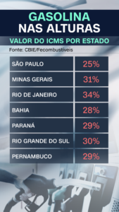 O preço da gasolina segue nas alturas. Em alguns estados, o litro já ultrapassa os R$ 7, e a expectativa é de mais aumentos. Uma das principais explicações está no ICMS (Imposto sobre Circulação de Mercadorias e Serviços), que varia de estado para estado. O ICMS representa hoje cerca de 30% do preço final da gasolina. Em São Paulo, por exemplo, o CMS está em 25%, já no Rio de Janeiro metade do valor do preço do litro de gasolina é imposto.