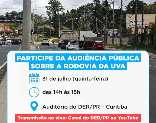 A duplicação da Rodovia da Uva (PR-417), que impacta diretamente a mobilidade dos colombenses, será tema de audiência pública na próxima quinta-feira, 31 de julho, das 14h às 15h, no auditório do DER/PR, em Curitiba, com transmissão ao vivo pelo YouTube.