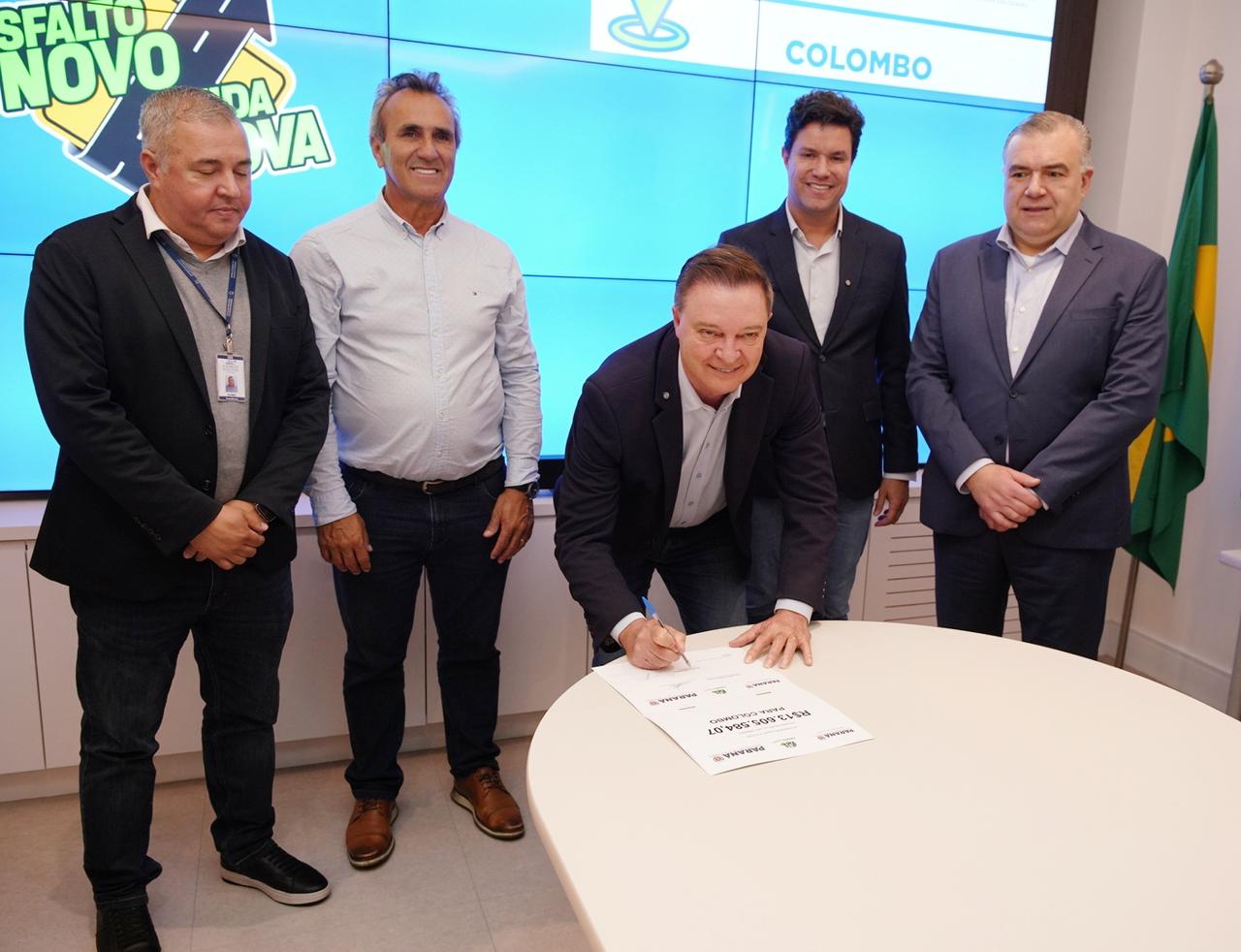 O prefeito de Colombo, Helder Lazarotto, acompanhado do vice-prefeito Paulo Coradin, participou nesta terça-feira (09) da assinatura do primeiro lote de recursos do programa “Asfalto Novo Vida Nova”, que trará mais infraestrutura e valorização para as ruas. Estavam presentes o Secretário das Cidades do Paraná, Guto Silva e Deputado Federal, Ney Leprevost.