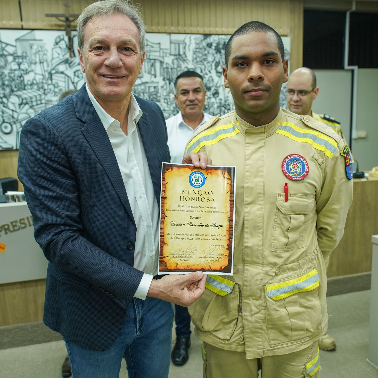 Na manhã desta quinta-feira (25), a Câmara Municipal de Colombo sediou a solenidade de Reconhecimento e Agradecimento aos militares do Corpo de Bombeiros Militar do Paraná e à Defesa Civil do município, em virtude da atuação na ocorrência registrada recentemente na empresa Enaex.