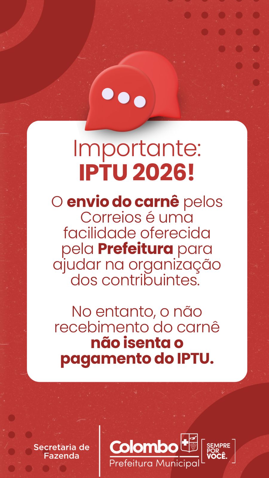O envio do carnê pelos Correios continua sendo uma facilidade oferecida para auxiliar na organização dos contribuintes. No entanto, a administração municipal reforça que o não recebimento do documento não isenta o pagamento do imposto.